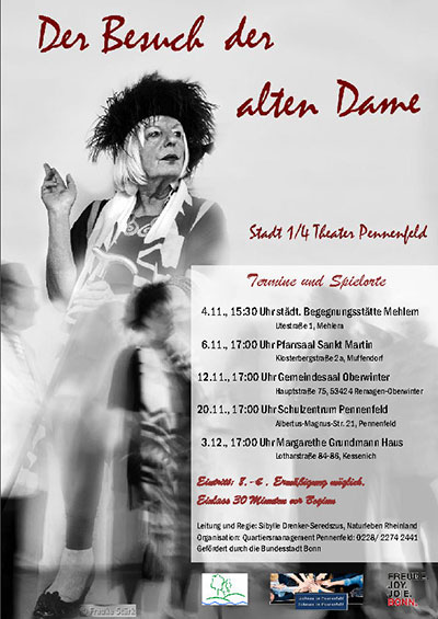 „Der Besuch der alten Dame“ ist eine tragische Komödie von Friedrich Dürrenmatt aus dem Jahre 1956. In einer gemeinsamen Kooperation mit dem „Stadt1/4-Theater Pennenfeld“ präsentiert das Theater [STÜCK]Werk das Stück am 12.11.2016 im Gemeindesaal Oberwinter , unter Leitung und Regie von Sibylle Drenker-Seredszus. Die Produktion wird gefördert durch die Bundesstadt Bonn im Rahmen des Quartiersmanagement Pennenfeld.