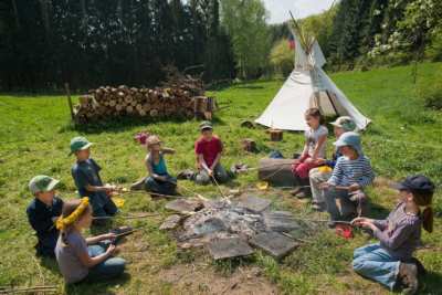 Wir hören Geschichten und Lieder aus dem Leben der Indianer, üben gemeinsam Gesänge und Tänze ein und entwickeln ein Stammesritual. Als Indianer pirschen wir leise durch den Wald, entdecken Tierspuren und üben ruhig zu verweilen, um Tiere zu beobachten. Bei Orientierungsspielen finden wir sicher zurück und lernen unterwegs, welche Pflanzen essbar sind und welche man besser nicht essen sollte. Wir widmen uns dem Bau von indianischen Jagdwerkzeugen wie Pfeil und Bogen und üben uns in der Kunst des Bogenschießens. Das Mittagessen werden wir auf unserem Lagerplatz am Großen Sioux-Tipi auch mal eigenhändig zubereiten, wobei wir selbst gesammelte Pflanzen mit verwenden.
